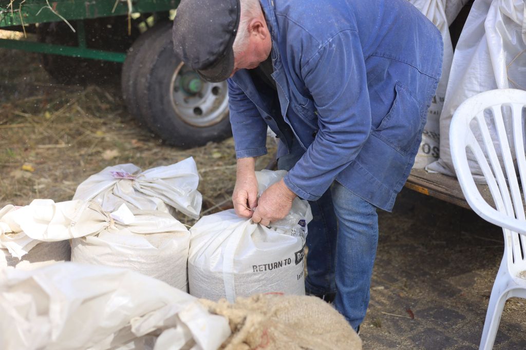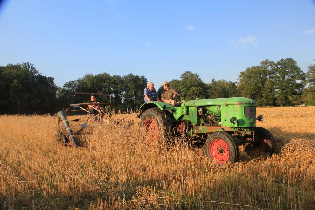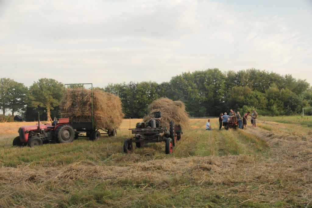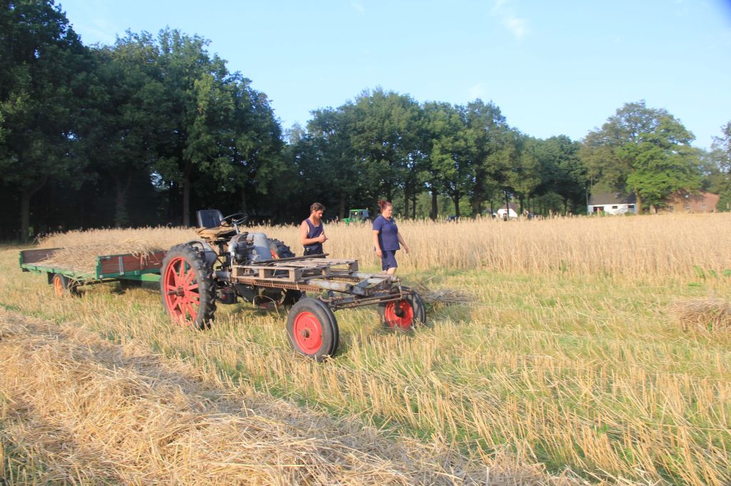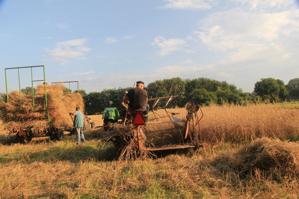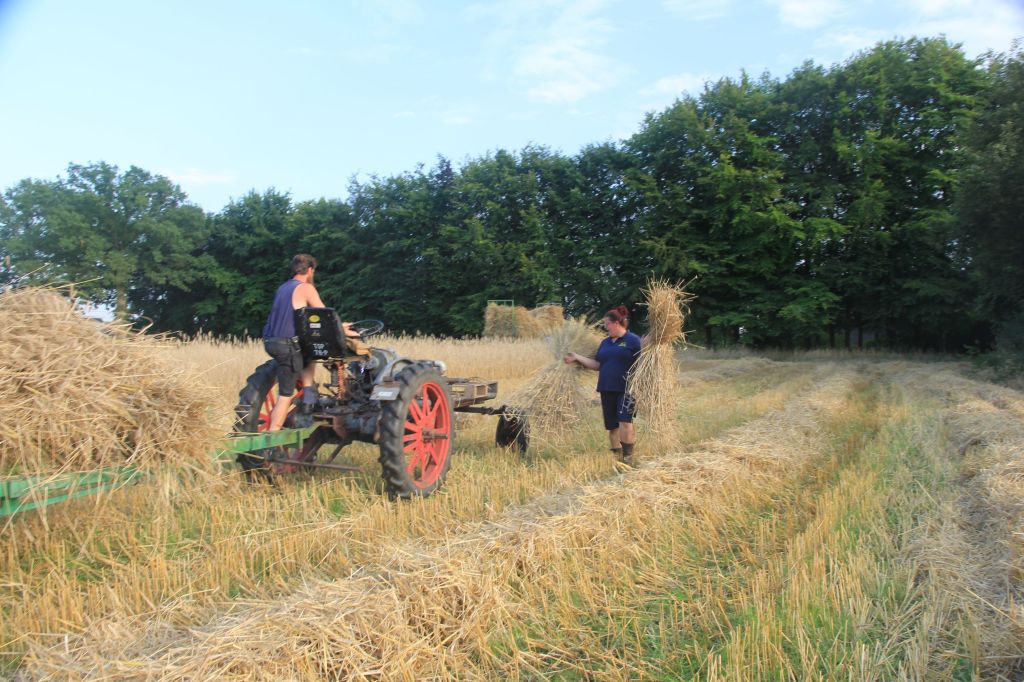 Het op ambachtelijke wijze maaien, binden en oogsten van het roggegewas.
